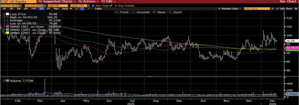 COP, küresel ölçekte faaliyet gösteren bağımsız bir petrol ve doğal gaz arama ve üretim şirketidir. Şirket, ağırlıklı olarak Kuzey Amerika, Avrupa, Asya-Pasifik ve Orta Doğu’da konvansiyonel ve konvansiyonel olmayan enerji kaynaklarının üretimine odaklanmaktadır. Hisse için Bloomberg’de yer alan analist beklentileri 12 aylık vadede ortalama 113,71 USD hedef fiyata ve son kapanış fiyatına göre %17,4 getiri potansiyeline işaret ediyor. S&P 500 endekisinin üzerinde bir getiri potansiyeline sahip olsa da, önümüzdeki dönemde hedef fiyatın yapılacak revizyonlarla endeks getirisinin üzerinde kalacağını öngörüyoruz. Hisse için 27 analist AL, 8 analist TUT tavsiyesi veriyor. Teknik açıdan yakın vadede 103 USD direnç, 94 USD ise destek seviyesi olarak takip edilebilir.