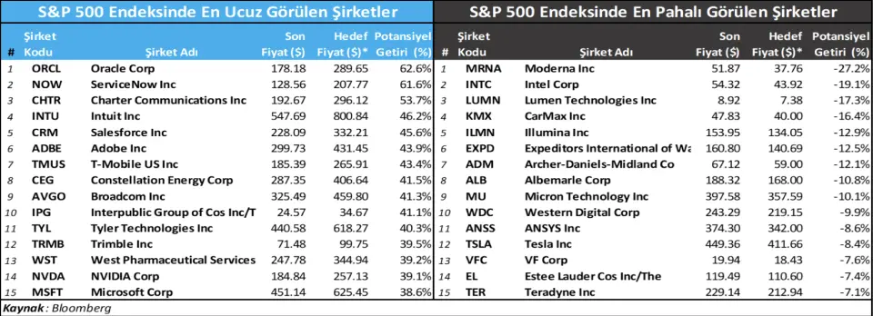 Bloomberg’de paylaşılan analist beklentilerine göre, potansiyel getiri oranlarına göre en ucuz görülen 15 şirketi ve yine potansiyellerine göre en pahalı görülen 15 şirketi aşağıdaki tablolarda paylaşıyoruz. Buradaki şirketler, belli bir piyasa değeri üzerindeki şirketler arasından filtrelenmiştir. Veriler, Tacirler Yatırım beklentilerini değil, Bloomberg’de paylaşılan ortalama analist hedef fiyatlarını ve potansiyellerini yansıtmaktadır.
