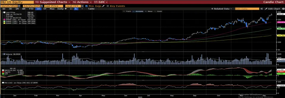 Micron Technology (MU) hisseleri, dün 286,68 dolardan kapanarak bir önceki günkü 276,27 dolarlık kapanışa göre güçlü bir yükseliş kaydetti. Bu hareket, yatırımcıların çip sektörüne olan ilgisinin sürmesi ve şirketin güçlü finansal performans beklentileriyle destekleniyor. Hisse, 50, 100 ve 200 günlük hareketli ortalamaların üzerinde işlem görerek teknik olarak sağlam bir konumda bulunuyor; RSI ve MACD göstergeleri de kısa vadeli pozitif momentumu doğruluyor. 286,68 dolarlık kapanış, 289,30 dolarlık zirveye yakın bir seviyede bulunurken, dirençler 289,30 ve 292,00 dolar civarında; destekler ise 281,75 ve 276,15 dolar seviyelerinde izleniyor. Piyasa değeri 323 milyar dolar olan Micron için analistlerin büyük çoğunluğu pozitif; %88’i “Al” önerisi verirken, yalnızca %4 “Sat” ve %8 “Tut” önerisi sunuyor.