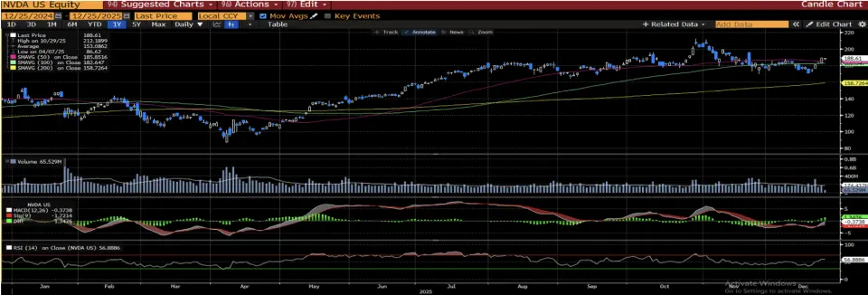 Nvidia (NVDA) hisseleri, bir önceki günkü kapanış olan 189,21 dolara kıyasla hafif gerileyerek 188,61 dolardan kapandı. Hisse, 50, 100 ve 200 günlük hareketli ortalamaların üzerinde işlem görmeye devam ederek teknik olarak güçlü bir konumda bulunuyor. Kritik seviyeler arasında dirençler 190,05 ve 192,00 dolar, destekler ise 186,60 ve 184,50 dolar olarak öne çıkıyor. Piyasa değeri 4,584 trilyon dolar olan Nvidia için analistlerin büyük çoğunluğu pozitif görüş bildiriyor; 76 analist (%92,7) “Al”, 1 analist (%1,2) “Sat” ve 5 analist (%6,1) “Tut” önerisi verirken, yatırımcıların hissede yükseliş potansiyeline güvendiği görülüyor.