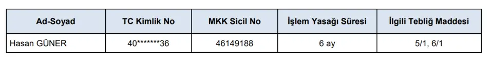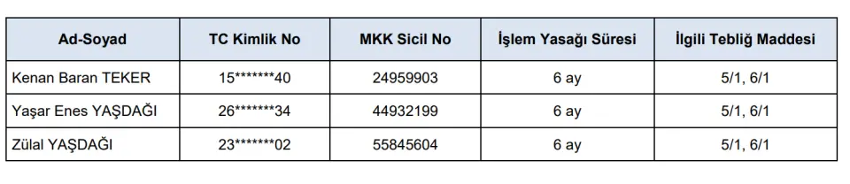 Bültende yer alan bir diğer önemli karar ise Frigo-Pak Gıda Maddeleri Sanayi AŞ (FRIGO) hisseleriyle ilgili oldu. Tıpkı AVTUR hisselerinde olduğu gibi, FRIGO pay piyasasında da yapay piyasa oluşturmaya yönelik işlemlerin engellenmesi hedeflendi.Kurul, bu hisselerdeki işlemleri nedeniyle aşağıdaki üç isme 25 Kasım 2025 tarihinden itibaren geçerli olmak üzere 6 ay süreyle işlem yasağı getirdi:
