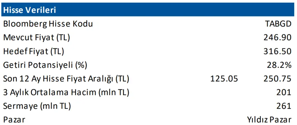 Mevcut durumda, TAB Gıda için 12-aylık hedef fiyatımız 316,50 TL, önerimiz de AL yönünde. 2025 tahminlerimize göre, TABGD hissesi 6,0x 2026 tahminlerimize göre ise 4,6x FD/FAVÖK çarpanı ile işlem görmektedir. Hisse, yıl başından itibaren BIST 100 endeksinin %53 üzerinde performans göstermiştir. Geriye dönük 12 aylık verilere göre hisse 22,5x F/K ve 6,8x FD/FAVÖK çarpanlarından işlem görmektedir.