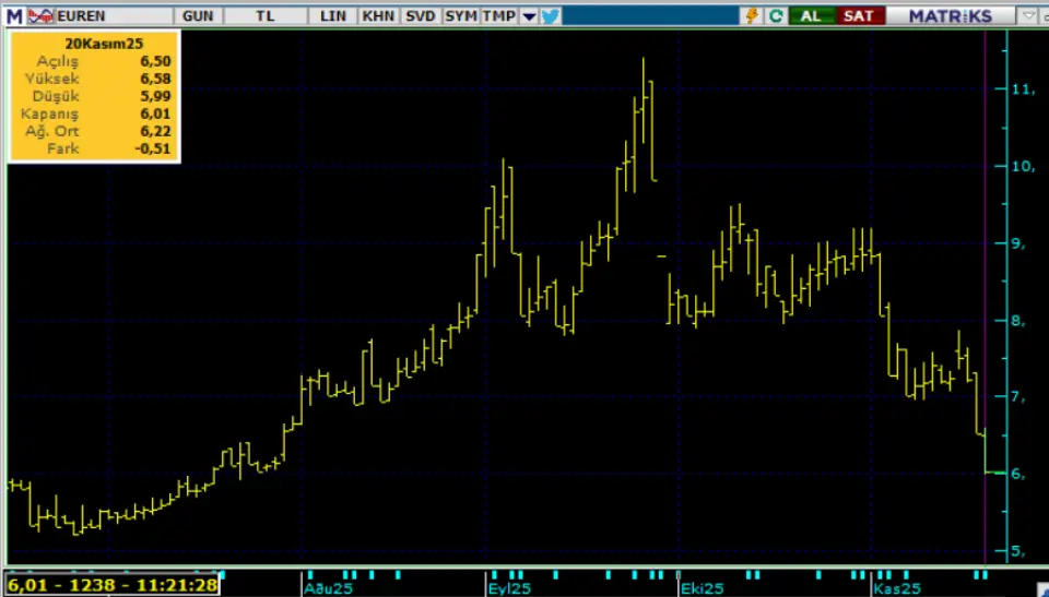 EUREN hissesinde bugün taban fiyat 5,87 TL ve hisse bugün en düşük olarak saat 11.30 itibariyle 5,99 TL gördü.