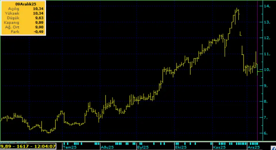 Özellikle Kasım ayı ortalarında tavan tavan gitmeye başlayan hisse, 13,88 TL zirve fiyata kadar primlendi. Kasım ayı sonunda aniden bir satış dalgası yiyen hisse 4 gün taban taban geri geldi ve 9,60 TL fiyata kadar düştü.