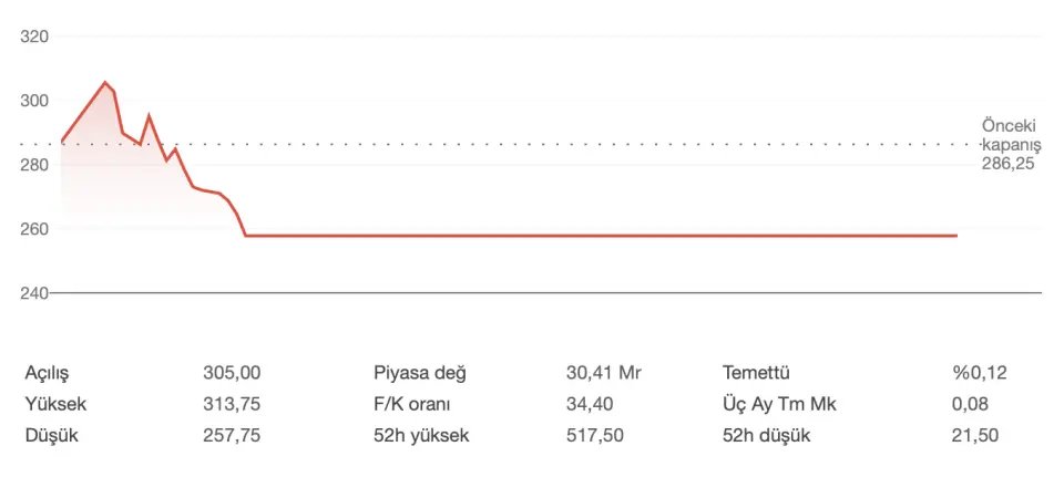 Bir önceki kapanışını 286,25 TL'den yapan hisse, 17 Aralık 2025'teki işlem gününe 305,50 TL'den başlangıç yaparak yatırımcılarını heyecanlandırmıştı. Saat 11.25 itibariyle de 257,75 TL'ye gerileyen SMRVA hissesi TABANı gördü.