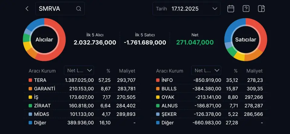SMRVA hissesini en fazla alan 5 aracı kurum şöyle: Tera Yatırım, Garanti BBVA Yatırım, İş Yatırım, Ziraat Yatırım ve Midas Menkul Değerler.SMRVA hissesini en çok satan 5 aracı kurum da şu şekilde: Info Yatırım, Bulls Yatırım, Oyak Yatırım, Alnus Yatırım ve Şeker Yatırım.