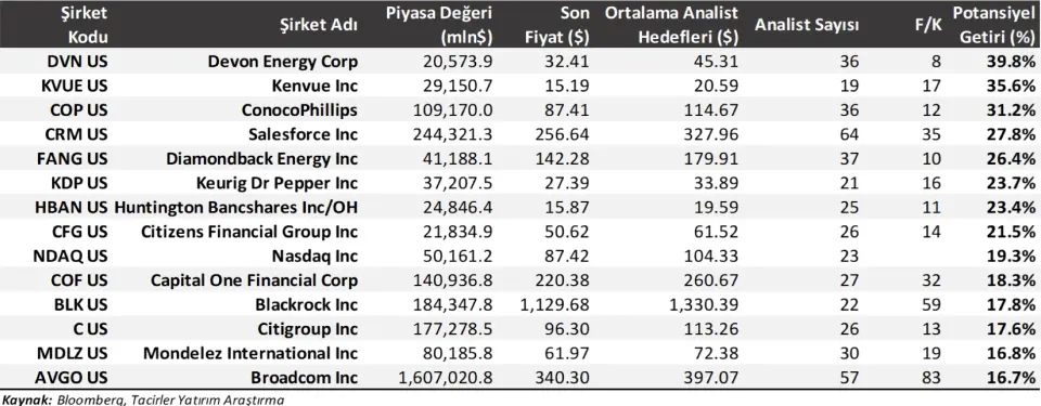 "Güncel değerleme / analiz raporları yayımlanan ve bu raporlarda Alım önerileri ile dikkat çeken S&P 500 şirketlerini yukarıda görebilirsiniz. Tablodaki veriler, Tacirler Yatırım beklentilerini değil, Bloomberg’de paylaşılan güncel analist beklentilerini yansıtmaktadır."