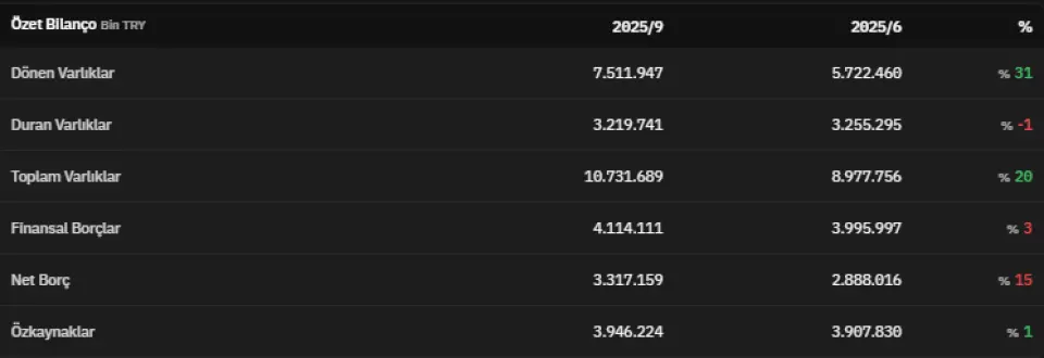 Dönen varlıklar 2025 yılının üçüncü çeyreğinde 7.511.947.000 TL olmuştur. 2025 yılının üçüncü çeyreğinde 3.219.741.000 TL olarak açıklanan duran varlıklar, 2025 yılının ikinci çeyreğinde 3.255.295.000 TL olarak açıklanmıştı. Toplam varlıklar üçüncü çeyrekte 10.731.689.000 TL olarak kaydedildi. 2025 yılının ikinci çeyreğinde 8.977.756.000 TL olarak açıklanan toplam varlıklar, 3. çeyrekte %20 artmış oldu. Finansal borçlar 2025 yılının üçüncü çeyreğinde 4.114.111.000 TL olarak kaydedildi.2025 yılının üçüncü çeyreğinde net borç 3.317.159.000 TL olarak açıklandı. Özkaynaklar 2025 yılının üçüncü çeyreğinde 3.946.224.000 TL olarak açıklandı. İlgili veri 2025 yılının ikinci çeyreğinde 3.907.830.000 TL olarak açıklanmıştı. Böylece özkaynaklar, 2025 yılının üçüncü çeyreğinde %1 artmış oldu.