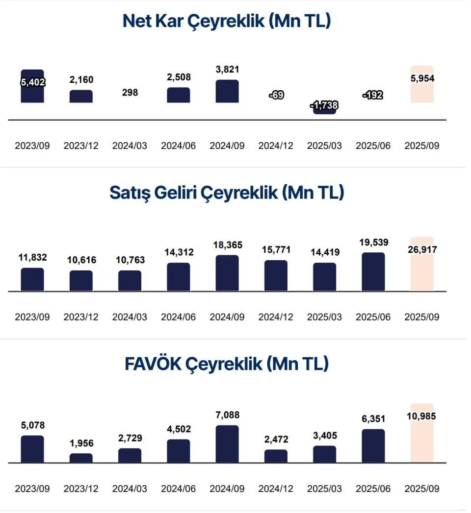Şirket 3Ç25 döneminde 6.0 milyar TL net kar açıkladı. Net kar yıllık bazda %55 azalış göstererek 4.0 milyar TL oldu. Çeyreklik net kar ise %56 artış göstererek 6.3 milyar TL oldu. Net kar marjı yıllık bazda %2.49 artışla %5.16 seviyesinde gerçekleşti.