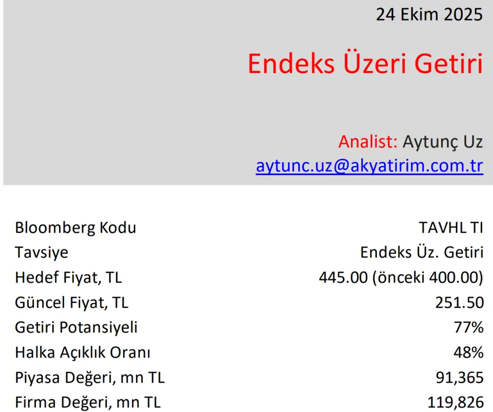 Ak Yatırım 24 Ekim 2025 tarihinde bir rapor yayınladı. Şirket yayınladığı raporda TAV Holding bilançosuyla ilgili yorumunu ve bilanço detaylarını paylaştı. Aracı kurum piyasa beklentisini ve kendi beklentilerini de ekledi. Ayrıca aracı kurum hisse için bir de hedef fiyat verdiğini açıkladı.