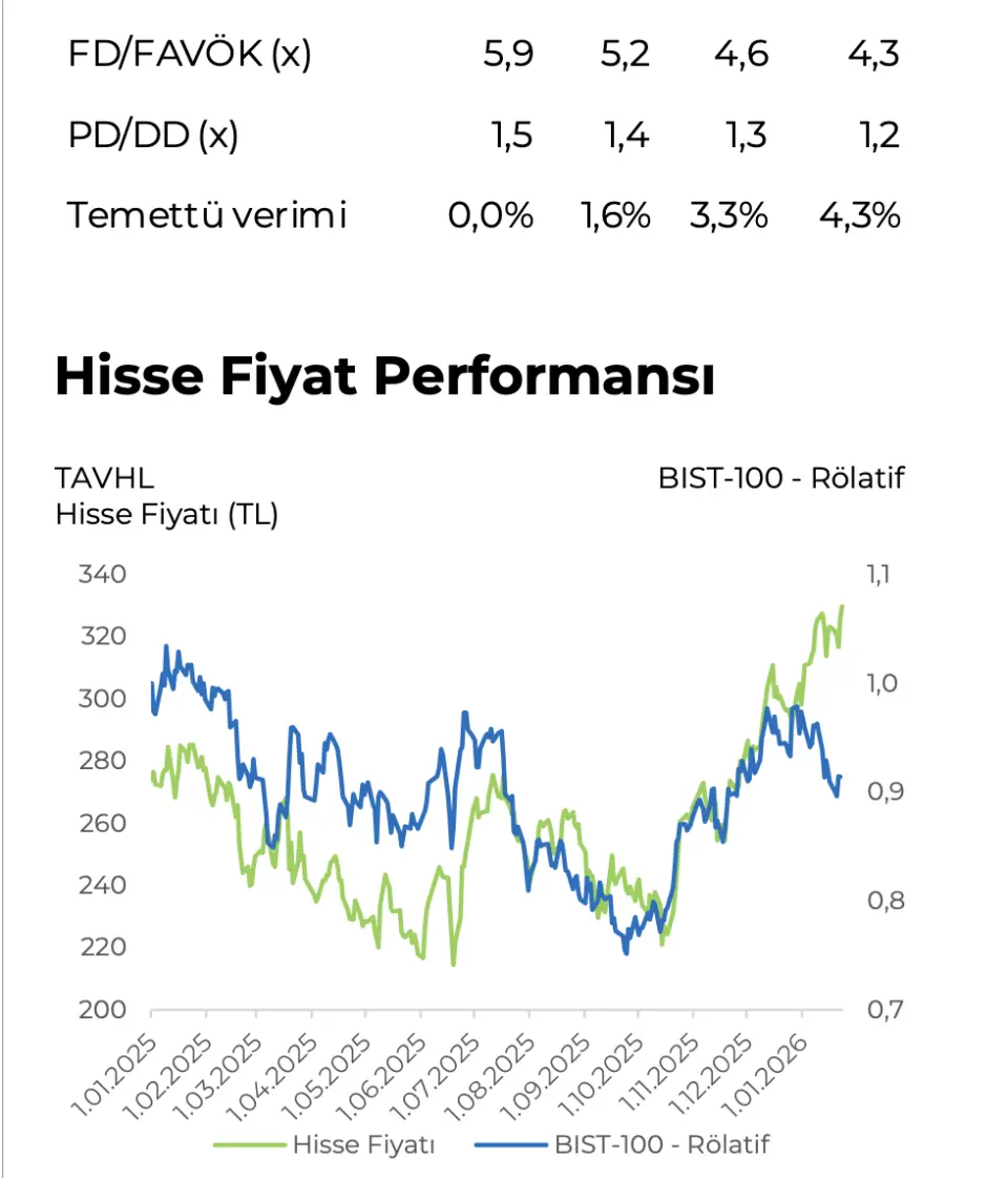 - "Yakın zamanda TAVHL, Tiflis sözleşmesi 2031 sonuna kadar uzattığını açıkladı. Tiflis’e kıyasla ölçek olarak daha düşük olmakla birlikte Batum için de şirketin çalışmaları sürüyor. Tiflis sözleşmesi, 2026-2027 yıllarında 150 milyon dolar yatırım taahhüdü ve 25 milyon dolar ön ödeme içeriyor. Şirketin yolcu başı gelirleri sabit kalmakla birlikte, geçmişteki %10 yer hizmet gelirlerinden alınan pay yerine yolcu gelirlerinin %30’u devlete ödeniyor olacak. Yeni anlaşmanın şartlar açısından yolcu başı gelirlerin artmaması ve ödenecek imtiyaz ücreti bakımından daha yüksek bir payın alınması nedeniyle pozitif etkiyi sınırladığını ancak yine de önemli bir varlık olan Tiflis’in kazanımının önemli olduğunu düşünüyoruz."