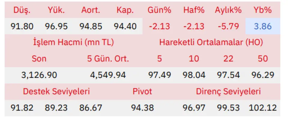 Gün içinde en düşük 91.80 en yüksek 96.95 seviyesini gören Turkcell İletişim Hizmetleri hissesinin günü %2.13 kayıpla tamamladığı gözlenmektedir. Pivot seviye 94.38 seviyesinden geçmekte olup, aşağı yönlü hareketlerde birinci destek 91.82, ikinci destek ise 89.23 seviyesinden geçmektedir. Dirençler ise sırasıyla 96.97, 99.53 seviyelerinden geçmektedir. Bu aşamada endeksin 5 günlük HO seviyesinin %3.17 altında, 22 günlük HO seviyesinin ise %3.22 altında hareket ettiği dikkat çekmektedir. Son gün işlem hacmi ise bu aşamada 5 günlük ortalama işlem hacminin % 31.28 altında gerçekleşmiştir.