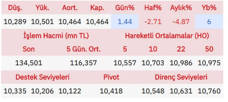 Ulusal 100 endeksinde, geçtiğimiz gündeki işlem aktivitesi 10289 - 10501 seviyeleri arasında gerçekleşti ve önceki güne göre yüzde 1.44 yükselişle (148.08 puan) kapandı. Endekste destek ve direnç olarak 10335 ve 10548 seviyelerini takip edeceğiz. Endeks son kapanışıyla, 5 günlük ortalamanın altında yer alırken 20 günlük ortalamasının da altında hareketine devam ediyor.