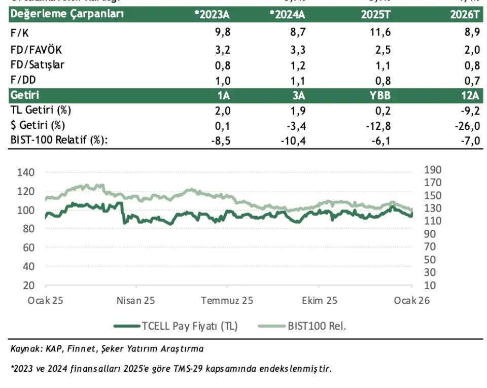 - "2026 yılında, Turkcell’de, faturalı abone oranındaki artış ve segment bazlı fiyatlama stratejisinin devamı sayesinde reel ARPU büyümesinin sürmesini, 5G’nin kademeli olarak devreye girmesiyle birlikte veri tüketimi ve dijital iş servisi gelirlerinin desteklenmesini, yüksek altyapı yatırımları nedeniyle yatırım harcamaları nominal olarak yükselse de gelirdeki artışla yatırım harcamaları/ satış gelirleri ’nin %24’ün üzerine çıkmasını beklemiyoruz. Net borç / FAVÖK rasyosunun 1x in altında kalmasını bekliyoruz."