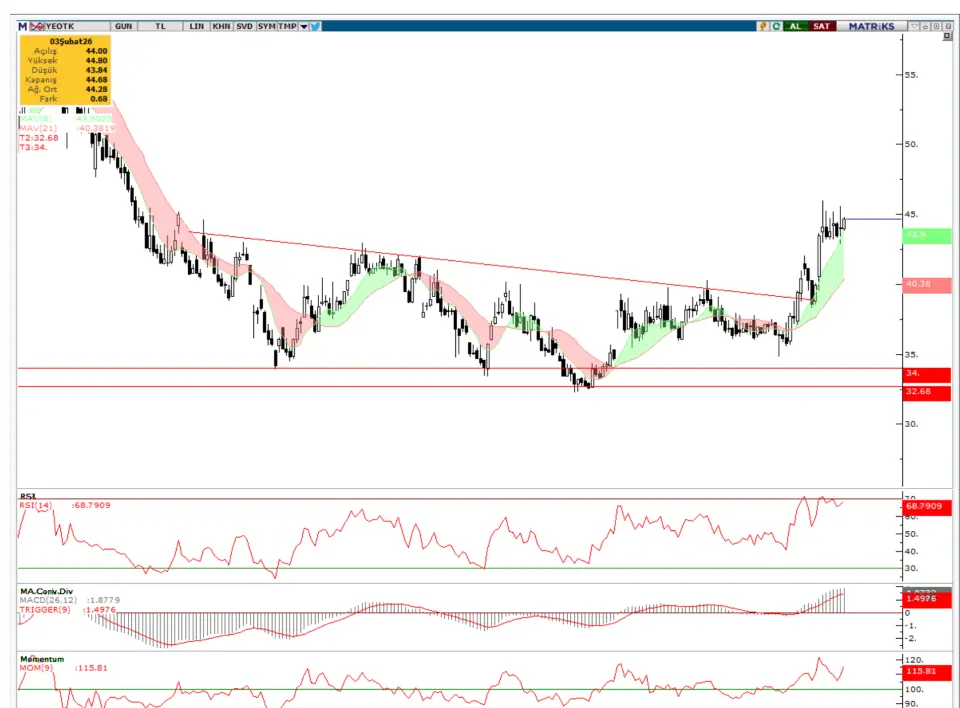 nedeniyle YEOTK hissesinde 45,36TL ve 46,00TL seviyelerine doğru hareketlilik söz konusu olabilir.