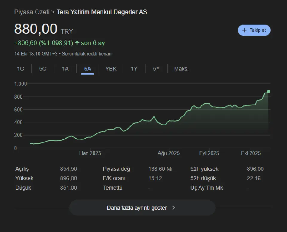 Borsa İstanbul’da işlem gören Tera Yatırım Menkul Değerler A.Ş. (TEHOL) hissesi, son altı aylık periyotta dikkat çeken bir performans sergiledi. Hisse fiyatı bu dönemde %1.098 oranında artış göstererek 22,16 TL seviyesinden 880 TL’ye yükseldi.
