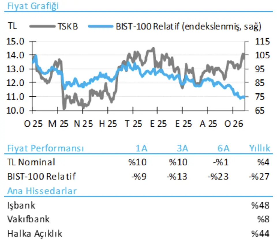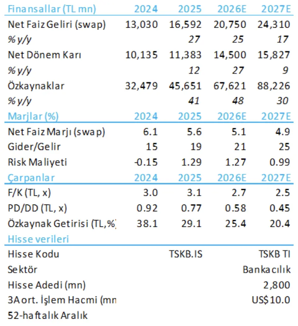 2026 bütçe beklentilerinin genel olarak tahminlerimizle uyumlu olduğunu, ancak geçen yıl olduğu gibi marj tarafında muhafazakâr bir yönlendirme sunulduğunu değerlendiriyoruz. Ayrıca, 2026 net kâr tahminimizin bankanın kalan TL1,1mlr tutarındaki serbest karşılıklarının ters çevrilmesini içerdiğini not etmek isteriz. Hisse 2026T için 0,58x PD/DD ve 2,7x F/K çarpanlarıyla cazip seviyelerde işlem görmekle birlikte, marjlardaki baskı nedeniyle sektör geneline kıyasla daha zayıf bir kâr ivmesi ve yıllık bazda özsermaye karlılığında gerileme öngörüyoruz.