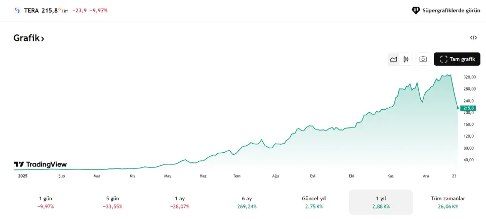 Özellikle son işlem günlerinde hızlanan satışlarla birlikte TERA hissesi %10’a yaklaşan günlük kayıplar yaşarken, haftalık bazda düşüş daha da dikkat çekici bir boyuta ulaştı. Bu gelişmeler, hissede pozisyon taşıyan yatırımcıların moralini olumsuz etkiledi.