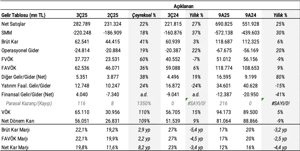 - "Gelir büyümesinde, yolcu gelirlerindeki güçlü hacim artışı etkisi- 3. çeyrekte THY toplam yolcu sayısı yıllık %11,1 artışla 27,2 mn yolcu seviyesine yükseldi. 9A25’te ise şirketin toplam yolcu sayısı yıllık %6,6 artışla 69,4 mn yolcu (Dış Hat:44,5 mn yolcu, +%7,7 y/y) olarak gerçekleşti. 9A25’te yolcu kapasitesinde %6,5’lik artış gerçekleşirken bu dönemde yolcu doluluk oranı %82,9 seviyesine yükselerek pozitif bir seyir izledi (9A24: %82,3). Şirketin yılın üçüncü çeyreğinde satış gelirleri yıllık %4,9 artışla 6,95 mlr $ (282,8 mlr TL) seviyesine ulaşırken, yolcu gelirleri güçlü hacim artışıyla birlikte yıllık %6,1 artışla 5,89 mlr $ seviyesine yükseldi. Kargo gelirleri ise bu çeyrekte, küresel ticaretin yavaşlaması ve deniz taşımacılığından gelen rekabetin artmasının etkisiyle, yıllık %7,2 azalış göstererek 845 mn $ seviyesine geriledi. Yolcu RASK ise 3Ç25’te yıllık %1,9 azalışla 7,92 USc (kur etkisi hariç: 7,93 USc) seviyesine geriledi."