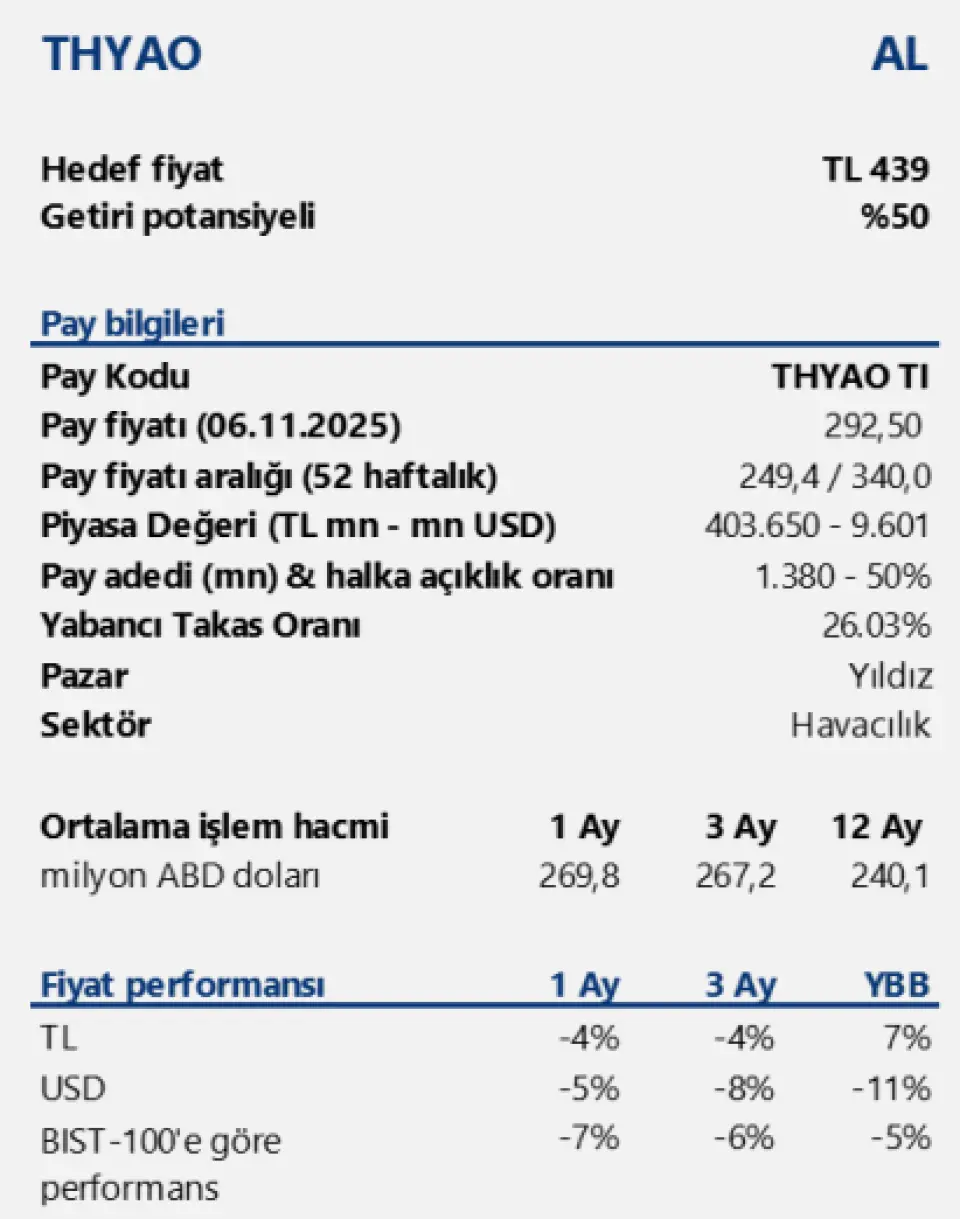 Türk Hava Yolları’nın 3Ç25 finansal sonuçlarını nötr olarak değerlendiriyoruz. Operasyonel karlılıkta marj baskısı sürerken, güçlü yolcu trafiği ve genişleyen uçuş ağı gelir büyümesini desteklemeye devam etti. Dönem içinde net kar beklentilerin üzerinde gerçekleşse de, FAVÖK tarafında görülen maliyet baskısı karlılık görünümünü sınırladı. Hisse için 12 aylık pay başına 439 TL hedef fiyatımızı ve “AL” tavsiyemizi koruyor, Türk Hava Yolları’nı uzun vadeli büyüme potansiyeli ve strateji haritası doğrultusunda model portföyümüzde tutmayı sürdürüyoruz.