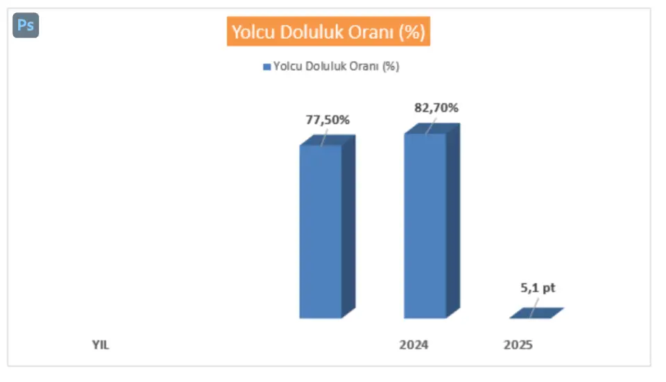 - Aralık 2024 döneminde yurt içi yolcu doluluk oranı %77,50 iken Aralık 2025’te 5,1 puan artışla %82,70 olarak gerçekleşti.