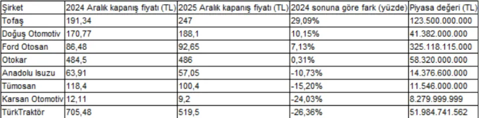 Borsada işlem gören 8 otomotiv şirketinin Aralık 2024 ile Aralık 2025 itibarıyla hisse kapanış fiyatı, değişimi ve şirketlerin piyasa değeri şöyle: