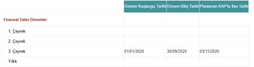Konuyla ilgili şirketten gelen KAP açıklaması haberin devamında yer almaktadır:Şirketimizin 01.01.2025 – 30.09.2025 hesap dönemine ilişkin finansal tablolarının 3 Kasım 2025 tarihinde kamuya açıklanması planlanmaktadır.