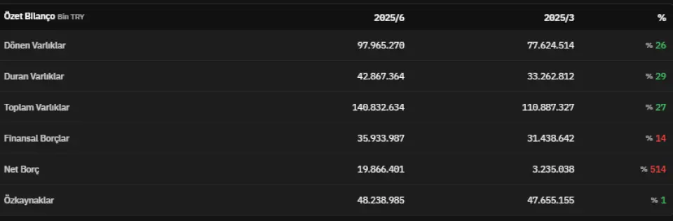 Dönen varlıklar 2025 yılının ikinci çeyreğinde 97.965.270.000 TL olmuştur. 2025 yılının ikinci çeyreğinde 42.867.364.000 TL olarak açıklanan duran varlıklar, 2025 yılının ilk çeyreğinde 33.262.812.000 TL olarak açıklanmıştı. Toplam varlıklar 2025 yılının ikinci çeyreğinde 140.832.634.000 TL olarak açıklanmıştır. 2025 yılının ilk çeyreğinde 110.887.327.000 TL olarak açıklanan toplam varlıklar, 2025 yılının ikinci çeyreğinde %27 artmış oldu.