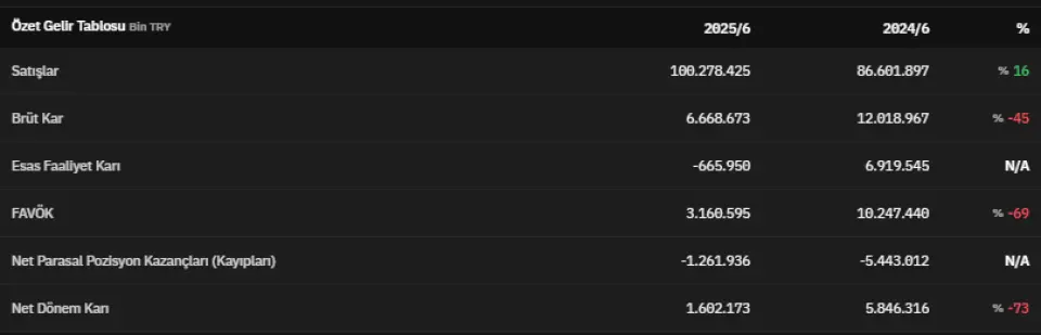 FAVÖK 2025 yılının ikinci çeyreğinde 3.160.595.000 TL olarak açıklanmıştır. Net Parasal Pozisyon Kazançları (Kayıpları) 2025 yılının ikinci çeyreğinde -1.261.936.000 TL olarak açıklanmıştır. Net dönem kârı ise 1.602.173.000 TL olarak kaydedildi. İlgili veri 2024 yılının ikinci çeyreğinde 5.846.316.000 TL olarak açıklanmıştı
