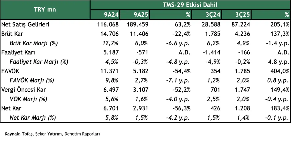 - "Tofaş, enflasyon muhasebesi (TMS-29 etkisi) uygulanmış finansallarına göre RT konsensüs ortalama net kar öngörüsü olan 1.598mn TL’nin %32,2 altında (Şeker: 1.628mn TL net kar) yıllık %183,4’lük artışla 1.208mn TL net kar elde etmiştir (3Ç24: 426mn TL). Stellantis’in konsolide edilmesiyle güçlü yükseliş gösteren satış gelirleri ve artan net parasal pozisyon kazançları net karı desteklerken yüksek pazarlama giderlerinin etkisiyle artış gösteren operasyonel giderler, düşüş gösteren net finansman gelirleri (3Ç24: 1.366mn TL, 3Ç25: 368mn TL) ve yazılan ertelenmiş vergi giderleri 3Ç25’te net karı baskılayan unsurlar olmuştur."