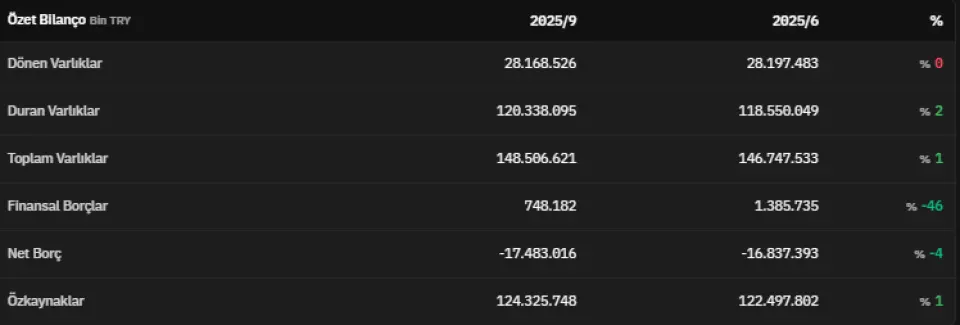 Dönen varlıklar 2025 yılının üçüncü çeyreğinde 28.168.526.000 TL olmuştur. 2025 yılının üçüncü çeyreğinde 120.338.095.000 TL olarak açıklanan duran varlıklar, 2025 yılının ikinci çeyreğinde 118.550.049.000 TL olarak açıklanmıştı. Toplam varlıklar üçüncü çeyrekte 148.506.621.000 TL olarak kaydedildi. Finansal borçlar 2025 yılının üçüncü çeyreğinde 748.182.000 TL olarak kaydedildi. 2025 yılının ikinci çeyreğinde 1.385.735.000 TL olarak açıklnan finansal borçlar, 3. çeyrekte %46 azalmış oldu.2025 yılının üçüncü çeyreğinde net borç -17.483.016.000 TL olarak açıklandı. Özkaynaklar 2025 yılının üçüncü çeyreğinde 124.325.748.000 TL olarak açıklandı. İlgili veri 2025 yılının ikinci çeyreğinde 122.497.802.000 TL olarak açıklanmıştı. Böylece özkaynaklar %1 artmış oldu.