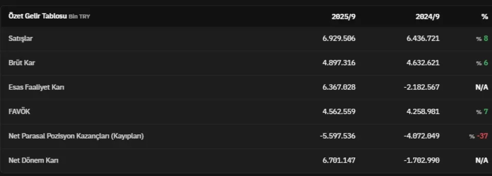 FAVÖK 2025 yılının üçüncü çeyreğinde 4.562.559.000 TL olarak açıklandı. Net parasal pozisyon kazançları 2025 yılının üçüncü çeyreğinde -5.597.536.000 TL olarak kaydedildi. Net dönem kârı ise 6.701.147.000 TL olarak kaydedildi.