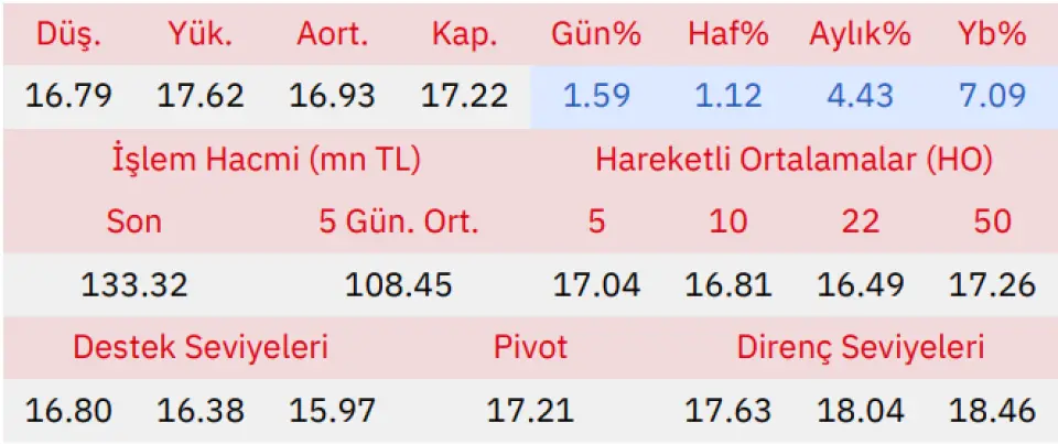 Gün içinde en düşük 16.79 en yüksek 17.62 seviyesini gören Türk İlaç ve Serum Sanayi hissesinin günü %1.59 kazançla tamamladığı gözlenmektedir. Pivot seviye 17.21 seviyesinden geçmekte olup, aşağı yönlü hareketlerde birinci destek 16.80, ikinci destek ise 16.38 seviyesinden geçmektedir. Dirençler ise sırasıyla 17.63, 18.04 seviyelerinden geçmektedir. Bu aşamada endeksin 5 günlük HO seviyesinin %1.07 üstünde, 22 günlük HO seviyesinin ise %4.41 üstünde hareket ettiği dikkat çekmektedir. Son gün işlem hacmi ise bu aşamada 5 günlük ortalama işlem hacminin % 22.93 üstünde gerçekleşmiştir.