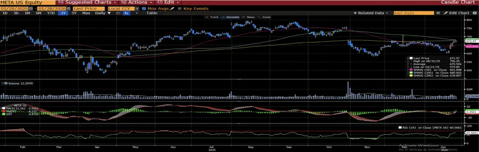 Meta Platforms, Inc. (META) hissesi dün 672,97 dolar kapanışıyla 200 günlük hareketli ortalamanın altında kalmasına rağmen 50 ve 100 günlük ortalamaların üzerinde tutunarak teknik açıdan dengeli ancak temkinli bir görünüm sergilerken, RSI'ın alım bölgesine yakın seyri ve MACD'nin pozitif bölgede kalması yukarı yönlü denemelerin sürdüğüne işaret ediyor.