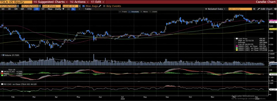 Tesla, Inc. (TSLA) hissesi dün 430,90 dolar seviyesinden kapanarak kısa vadede zayıf seyrini sürdürdü. Hissenin 50 ve 100 günlük hareketli ortalamaların altında, ancak 200 günlük ortalamanın üzerinde kalması, orta vadeli baskının devam ettiğine, buna karşın uzun vadeli ana trendin henüz bozulmadığına işaret ediyor.