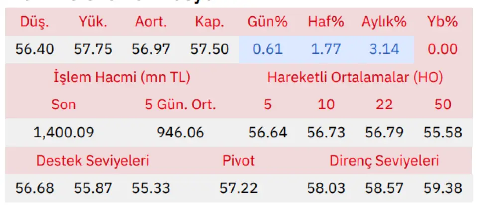 Gün içinde en düşük 56.40 en yüksek 57.75 seviyesini gören Türk Telekomünikasyon hissesinin günü %0.61 kazançla tamamladığı gözlenmektedir. Pivot seviye 57.22 seviyesinden geçmekte olup, aşağı yönlü hareketlerde birinci destek 56.68, ikinci destek ise 55.87 seviyesinden geçmektedir. Dirençler ise sırasıyla 58.03, 58.57 seviyelerinden geçmektedir. Bu aşamada endeksin 5 günlük HO seviyesinin %1.52 üstünde, 22 günlük HO seviyesinin ise %1.25 üstünde hareket ettiği dikkat çekmektedir. Son gün işlem hacmi ise bu aşamada 5 günlük ortalama işlem hacminin % 47.99 üstünde gerçekleşmiştir.