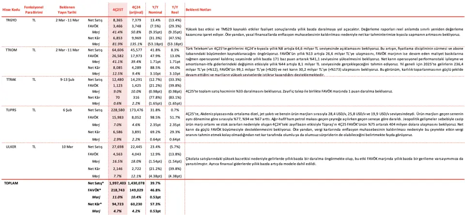 - "4Ç25’te, Akdeniz piyasasında ortalama dizel, jet yakıtı ve benzin ürün marjları sırasıyla 28,4 USD/v, 25,8 USD/v ve 19,9 USD/v seviyesindeydi. Ürün marjları geçen senenin aynı dönemine göre sırasıyla %77, %94 ve %67 arttı. Ağır-hafif ham petrol makası geçen çeyreğe açılırken geçen seneye göre daraldı. Jeopolitik gelişmeler sebebiyle cazip ürün marjı ortamı ve stok zararları nedeniyle oluşan 4Ç24’teki zayıf bazın etkisiyle Tüpraş’ın 4Ç25 FAVÖK’ünün %75 artarak 404 milyon dolara ulaşmasını bekliyoruz. Net karın da güçlü FAVÖK büyümesiyle desteklenmesini bekliyoruz. Öte yandan, vergi karlarında enflasyon muhasebesinin kaldırılması nedeniyle bu çeyrekte etkin vergi oranını tahmin etmek kolay olmadığından net kar tarafında olumlu ya da olumsuz sürprizlerin de olabileceğini belirtmekte fayda görüyoruz."