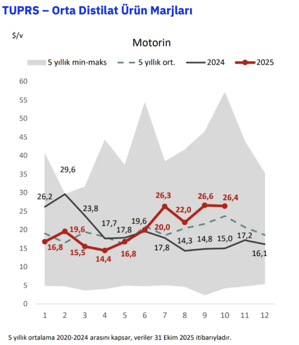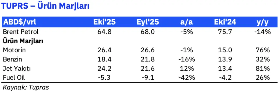 "Tüpraş, 2025 yılı üçüncü çeyrek finansal sonuçlarının açıklanmasının ardından, yıllık net rafinaj marjı tahminini varil başına 5-6 ABD dolarından (9A25: 6,5 ABD doları/varil) 6,0-6,5 ABD doları/varil aralığına yükseltti. Mevcut marj eğilimleri tarihsel ortalamaların oldukça üzerinde olduğundan, Tüpraş’ın yeni rafinaj marjı tahminini oldukça ulaşılabilir, hatta temkinli buluyoruz.