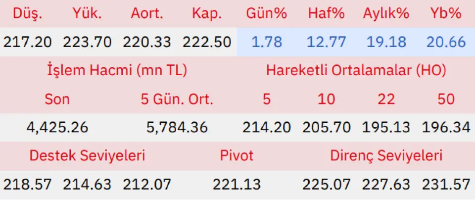 Gün içinde en düşük 217.20 en yüksek 223.70 seviyesini gören Türkiye Petrol Rafinerileri hissesinin günü %1.78 kazançla tamamladığı gözlenmektedir. Pivot seviye 221.13 seviyesinden geçmekte olup, aşağı yönlü hareketlerde birinci destek 218.57, ikinci destek ise 214.63 seviyesinden geçmektedir. Dirençler ise sırasıyla 225.07, 227.63 seviyelerinden geçmektedir. Bu aşamada endeksin 5 günlük HO seviyesinin %3.87 üstünde, 22 günlük HO seviyesinin ise %14.03 üstünde hareket ettiği dikkat çekmektedir. Son gün işlem hacmi ise bu aşamada 5 günlük ortalama işlem hacminin % 23.50 altında gerçekleşmiştir.