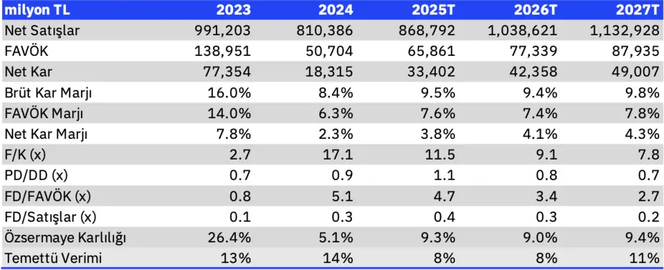 - "Bu revizyon, kar tahminlerimizde hafif yukarı yönlü revizyonların yanı sıra daha düşük yatırım harcamaları ve daha yüksek net nakit varsayımlarını içeriyor. Son 3 ayda %32 yükselişle BIST-100 endeksine göre %34 daha iyi performans gösteren hisseler, 2025 ve 2026 tahminlerimize göre sırasıyla 4,7x ve 3,4x FD/FAVÖK çarpanlarıyla hala cazip seviyelerde işlem görmektedir. Zayıf mevsimselliğe rağmen, özellikle son bir ayda daha da güçlenen dizel ve benzin marjlarının 2025 yılının 4. çeyreğinde şirketin kârlılığını desteklemesini bekliyoruz."