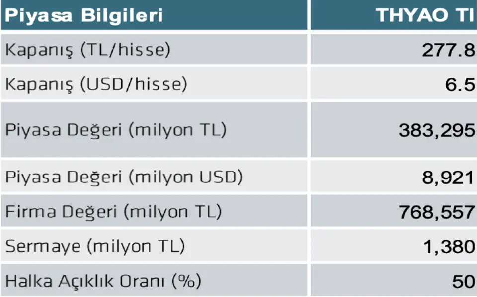 Türk Hava Yolları için hedef fiyatımızı 400 TL ve tavsiyemizi AL yönünde sürdürüyoruz. Şirket hisseleri 2025T göre 3.56x F/K ve 3.58x FD/FAVÖK çarpanlarıyla işlem görmektedir.