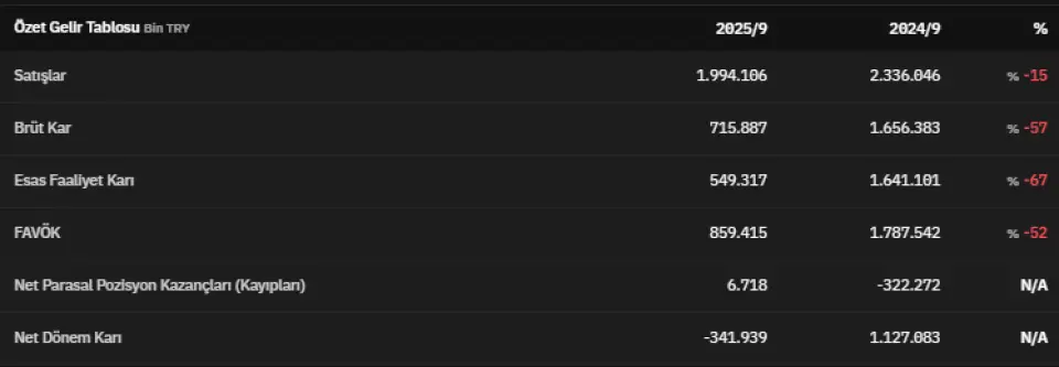 FAVÖK 2025 yılının üçüncü çeyreğinde 859.415.000 TL olarak açıklandı. Net parasal pozisyon kazançları 2025 yılının üçüncü çeyreğinde 6.718.000 TL olarak kaydedildi. Net dönem kârı ise -341.939.000 TL olarak kaydedildi.