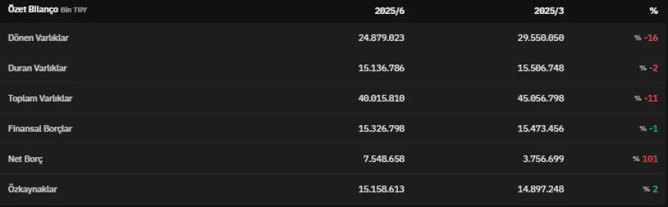 Dönen varlıklar 2025 yılının ikinci çeyreğinde 24.879.023.000 TL olmuştur. 2025 yılının ikinci çeyreğinde 15.136.786.000 TL olarak açıklanan duran varlıklar, 2025 yılının ilk çeyreğinde 15.506.748.000 TL olarak açıklanmıştı. Toplam varlıklar 2025 yılının ikinci çeyreğinde 40.015.810.000 TL olarak açıklanmıştır.