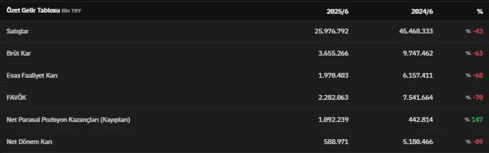 FAVÖK 2025 yılının ikinci çeyreğinde 2.282.063.000 TL olarak açıklanmıştır. Net Parasal Pozisyon Kazançları (Kayıpları) 2025 yılının ikinci çeyreğinde 1.092.239.000 TL olarak açıklanmıştır. 2024 yılının ikinci çeyreğinde 442.814.000 TL olarak açıklanan kazançlar 2025 yılının ikinci çeyreğinde %147 artmış oldu. Net dönem kârı ise 588.971.000 TL olarak kaydedildi. İlgili veri 2024 yılının ikinci çeyreğinde 5.180.466.000 TL olarak açıklanmıştı
