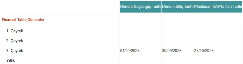 Konuyla ilgili şirketten gelen KAP açıklaması haberin devamında yer almaktadır:"Şirketimizin 01.01.2025 – 30.09.2025 hesap dönemine ilişkin finansal raporlarının 27 Ekim 2025 tarihinde kamuya açıklanması planlanmaktadır.