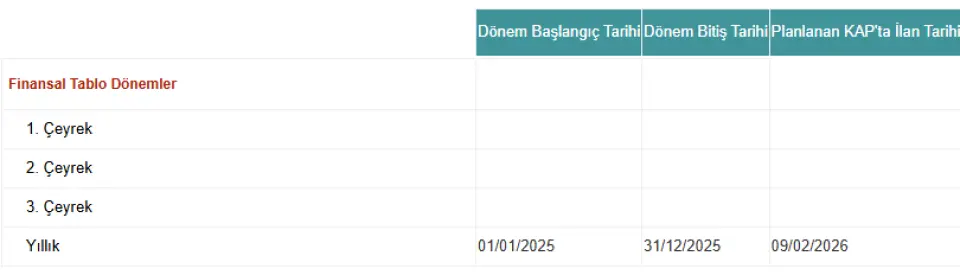"Şirketimizin 01.01.2025 – 31.12.2025 hesap dönemine ilişkin finansal raporlarının 9 Şubat 2026 tarihinde kamuya açıklanması planlanmaktadır.