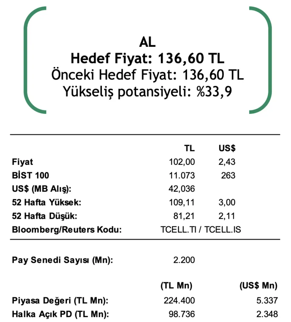 5G ihalesi TCELL’in kısa vadede borçluluğunu artıracak olsa da, şirketin finansal yapısının güçlü ve sürdürülebilir olması nedeniyle bu durumun uzun vadede önemli bir risk oluşturmayacağını düşünmekteyiz. Bu nedenlerle, açıklanan finansalların hisse fiyatı üzerinde hafif pozitif bir etki yaratmasını bekliyoruz. 3Ç25 finansalları sonrası, Şirket için 136,60 TL olan hedef pay fiyatımızı ve “AL” tavsiyemizi koruyoruz. Hedef pay fiyatımız cari pay fiyatına göre %33,9 kazandırma potansiyeli taşımaktadır.