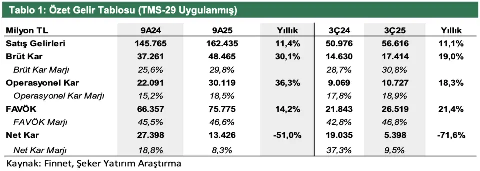 (Beklentiler 2025 yılı enflasyonunun %32 seviyesinde gerçekleşeceği varsayımına dayanmaktadır) Açıklanan 3Ç25 finansal sonuçları genel olarak beklentilerle uyumlu gerçekleşmiş, net kâr rakamı ise tahminlerin %6,5 üzerinde gerçekleşmiştir. Rekabete rağmen etkin yönetim ve güçlü operasyonların ardından şirketin 2025 yılı beklentileri yukarı yönlü revize edilmiştir.