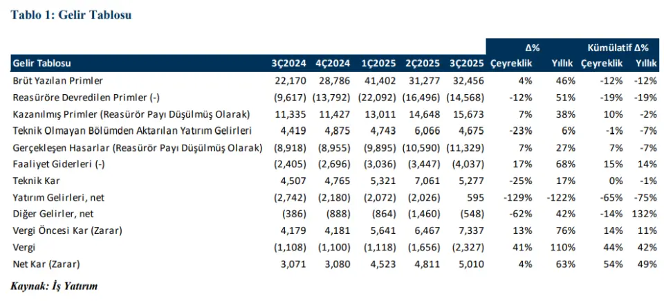 "Net kar beklenlere paralel. Türkiye Sigorta 2025 yılının üçüncü çeyreğinde TL 5.0 milyar net kar açıklayarak bizim beklentimiz olan TL 4.92 milyara oldukça paralel gerçekleşti. Çeyreklik olarak %4 artan net kar yıllık bazda geçen senenin aynı çeyreğine göre %63 yükselmiş durumda. Şirket üçüncü çeyrekte %53’lük bir yıllıklandırılmış özkaynak karlılığına ulaşmış durumda. Teknik kar marjları üçüncü çeyrekte daraldı .