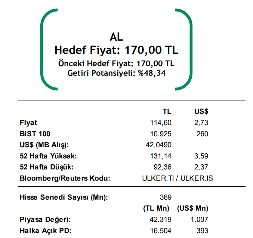 Aracı kurum hisse için 170 TL'lik bir hedef fiyat verdi.Bunun yanında hissenin güncel fiyatına göre hedef fiyat %48,34'lük bir getiri potansiyleini yansıtıyor. Aracı kurumun raporu şu şekilde: